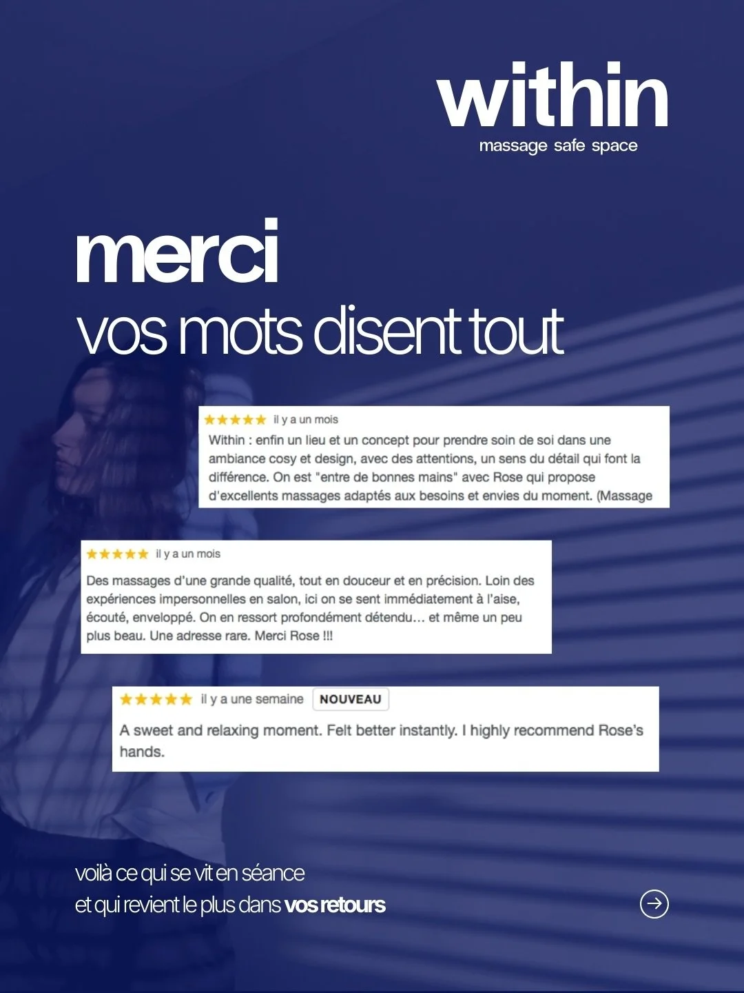 — A.A - visité en 2025« Un moment hors du temps passé chez Within, je venais pour des douleurs ciblées et Rose a su me soulager avec douceur, le tout enveloppé de bienveillance ! Je recommande à 1000% »